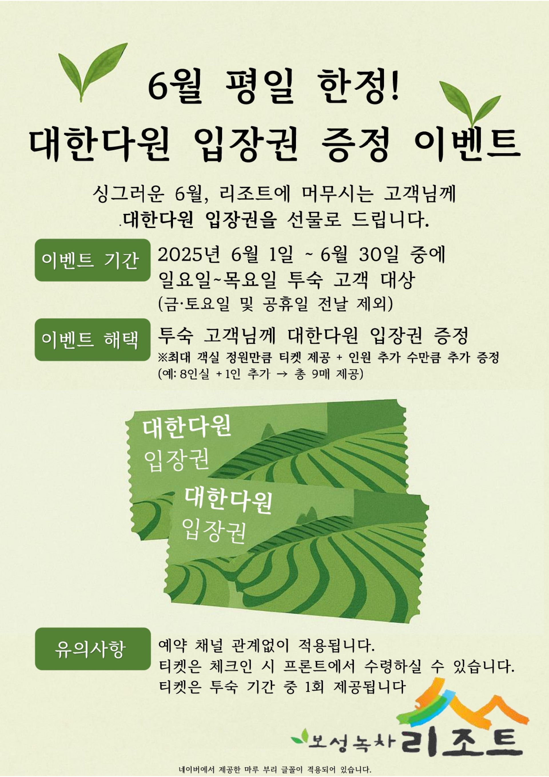 6월 평일 한정! 대한다원 입장권 증정 이벤트